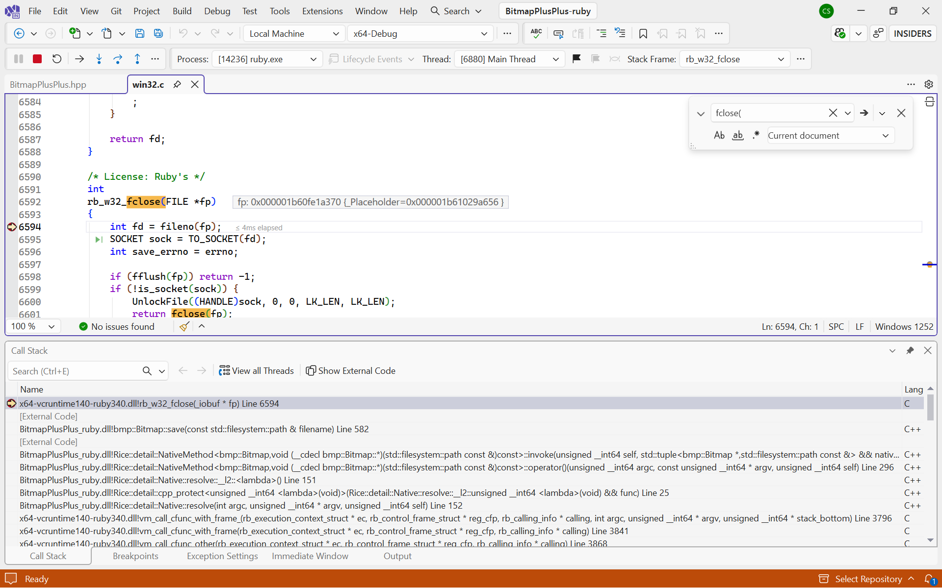 However when I use the extension to write a bitmap to disk the bitmap is corrupted. This is because the library uses std::ofstream which eventually uses the C API fclose to write the final bytes to the bitmap file and then closes it. The problem is that Ruby overrides fclose and replaces it with rb_w32_fclose. It then exports its custom version from from x64-vcruntime140-ruby340.dll. And the exported version is broken (at least from the standpoint of the C standard library).