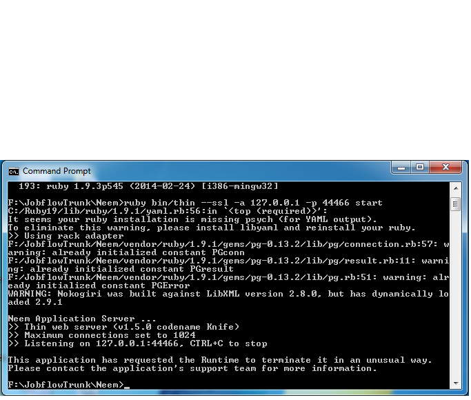 Yes only this comes in console without any backtrace. Pop only only shows "ruby193p194 has stopped working". I am attaching screenshot of pop-up for your reference